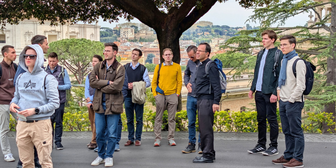 A highlight of the program was the "Benedict Walk", following the footsteps of Benedict XVI in Rome. The stops ranged from the Church of Santa Maria dell'Anima, where Joseph Ratzinger stayed during the Second Vatican Council, to St Peter's Basilica and to the Palazzo del Sant'Ufficio, where Cardinal Ratzinger served as Prefect for the Congregation for the Doctrine of the Faith for more than 23 years. It was lovely to visit his former residence, new the apartment of Cardinal Müller who gave the group a warm welcome. Equally impressive was the visit to the Vatican Gardens, where Benedict XVI lived as Pope Emeritus in a small monastery.