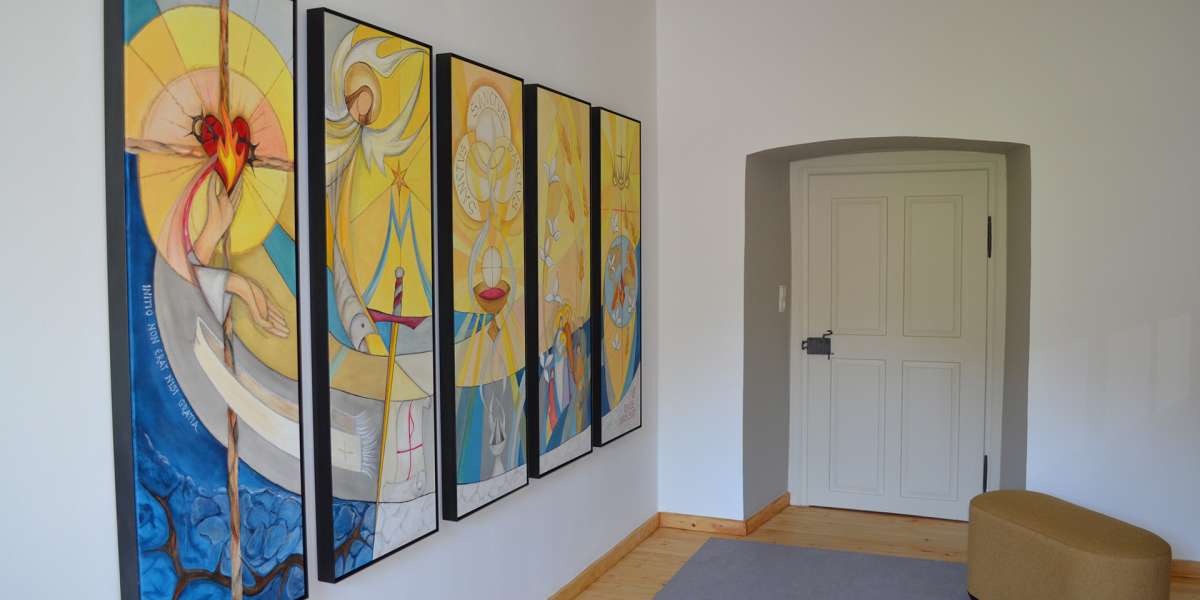 Five acrylic paintings by Sister Johanna Szalachy FSO catch the visitor's eye. The series of paintings depicts the ‘Image of the Covenant’. Using shapes, colours and corresponding motifs, Sister Johanna artistically represents the charism of The Work: